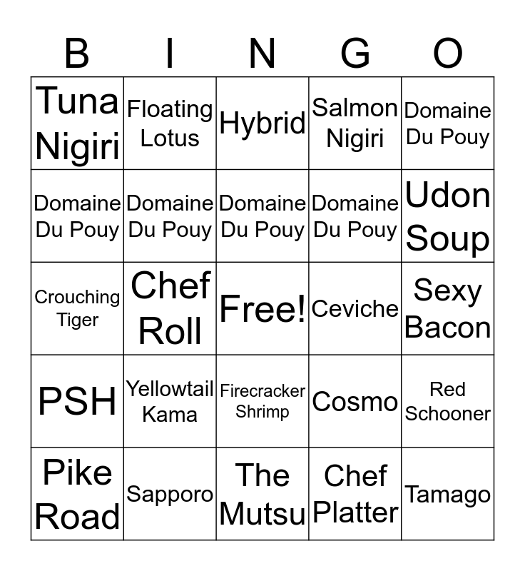 This bingo card has a free space and 24 words: Pike Road, Yellowtail Kama, Domaine Du Pouy, Chef Platter, Domaine Du Pouy, Tuna Nigiri, Floating Lotus, Hybrid, Ceviche, Sexy Bacon, Crouching Tiger, Domaine Du Pouy, Cosmo, Red Schooner, Domaine Du Pouy, Sapporo, The Mutsu, Salmon Nigiri, Udon Soup, PSH, Chef Roll, Firecracker Shrimp, Domaine Du Pouy and Tamago.