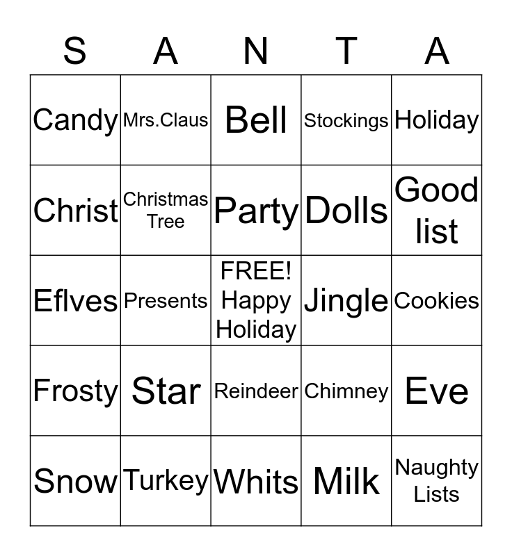 This bingo card has a free space and 24 words: Star, Turkey, Party, Snow, Holiday, Candy, Christ, Mrs.Claus, Jingle, Reindeer, Dolls, Eflves, Chimney, Eve, Christmas Tree, Milk, Cookies, Bell, Good list, Presents, Naughty Lists, Frosty, Stockings and Whits.