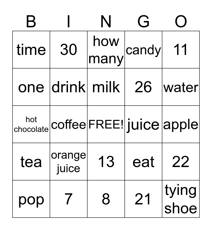 This bingo card has a free space and 24 words: orange juice, 7, milk, pop, 11, time, one, 30, juice, 13, 26, hot chocolate, eat, 22, drink, 21, apple, how many, water, coffee, tying shoe, tea, candy and 8.