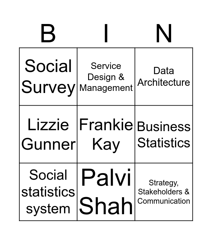 This bingo card has 24 words: Free!, School Census, Palvi Shah, Transformation, Frankie Kay, Social Survey, Business Statistics, Service Design & Management, Programme Delivery, Income, Strategy, Stakeholders & Communication, Steve Dunstan, Migration, Population, Social statistics system, Data as a Service (DaaS), Methodology, Data Architecture, 14, 87, 21st March 2021, 1st November 2018, Lizzie Gunner and Ian Tucker.