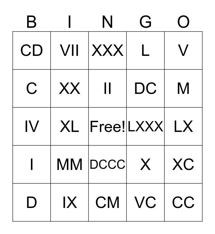 This bingo card has a free space and 24 words: MM, IX, II, D, V, CD, C, VII, LXXX, DCCC, DC, IV, X, XC, XX, VC, LX, XXX, M, XL, CC, I, L and CM.