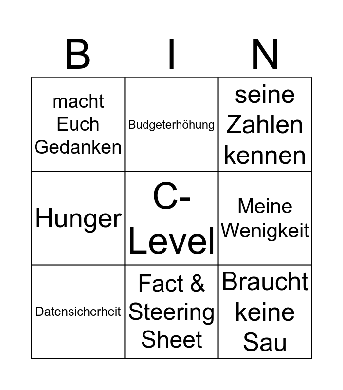 This bingo card has 36 words: Leute entlassen, schlicht und ergreifend, seeing is believing, Datensicherheit, Entscheider, Executive Summary, Fact & Steering Sheet, Tripple A, C-Level, Fingerpointing, lange rede, kurzer sinn, Hunger, Navabi, KUR, ich hab' gleich noch nen Termin, macht Euch Gedanken, Ich mag Dich wirklich, aber.., WaWi, Warenverfügbarkeit, seine Zahlen kennen, Jeder macht mal 'n Fehler, aber..., Inkompetenz, sind eh alles Pfeifen!, Die Zukunft, Mike, Budgeterhöhung, AWG ist unser beste Kunde, Umsatzrückgang, Braucht keine Sau, Meine Wenigkeit, Nichts desto weniger, Da müssen wir nochmal reden, No Brainer, Tonspur, Am Ende des Tages and Expertise.
