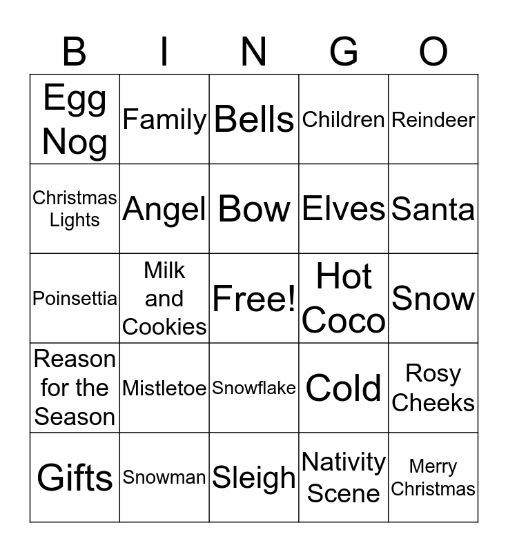 This bingo card has a free space and 39 words: Christmas tree, Jesus, Merry, Angel, Gifts, Snowflake, Bow, Christmas Carols, Reindeer, Reason for the Season, Milk and Cookies, Children, Merry Christmas, Snow, Hot Coco, Mistletoe, Ornaments, Egg Nog, North Pole, Cold, Christmas Lights, Sleigh, Elves, Santa, Toys, Coal, Holly, Candy Canes, Wreath, Family, Fire, Star, Bells, Snowman, Nativity Scene, WinterWonderland, Rosy Cheeks, Poinsettia and Ice Skates.