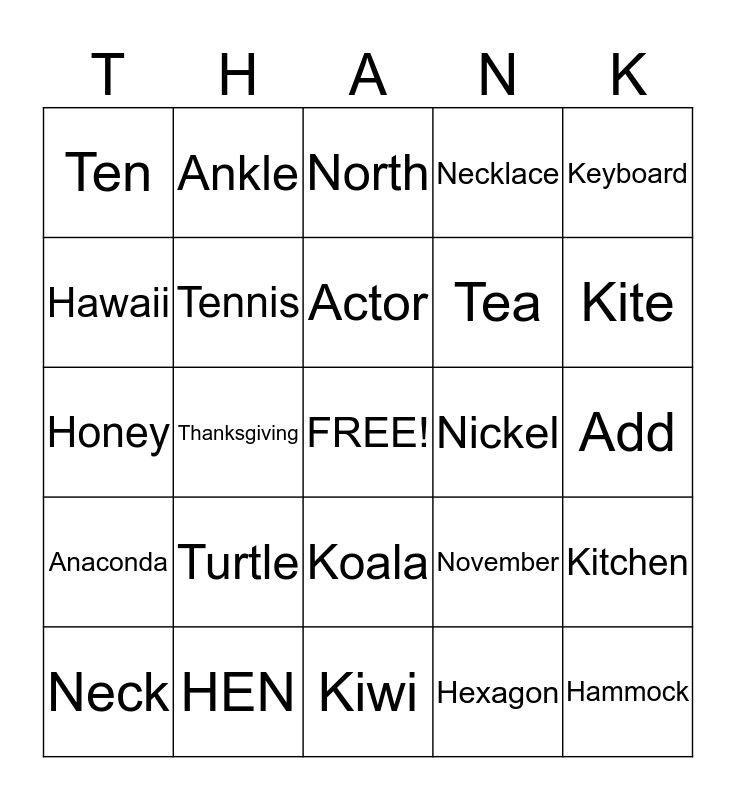 This bingo card has a free space and 24 words: Turtle, HEN, Actor, Neck, Keyboard, Ten, Hawaii, Ankle, Nickel, Koala, Tea, Honey, November, Kitchen, Tennis, Hexagon, Add, North, Kite, Thanksgiving, Hammock, Anaconda, Necklace and Kiwi.