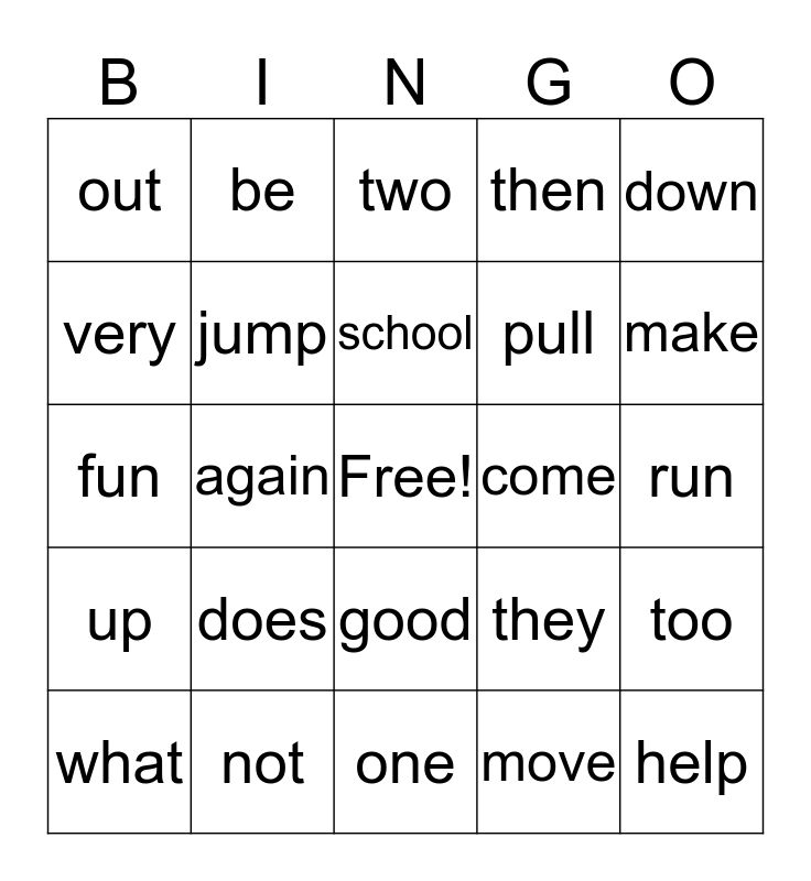 This bingo card has a free space and 24 words: does, not, school, what, down, out, very, be, come, good, pull, fun, they, too, jump, move, run, two, make, again, help, up, then and one.