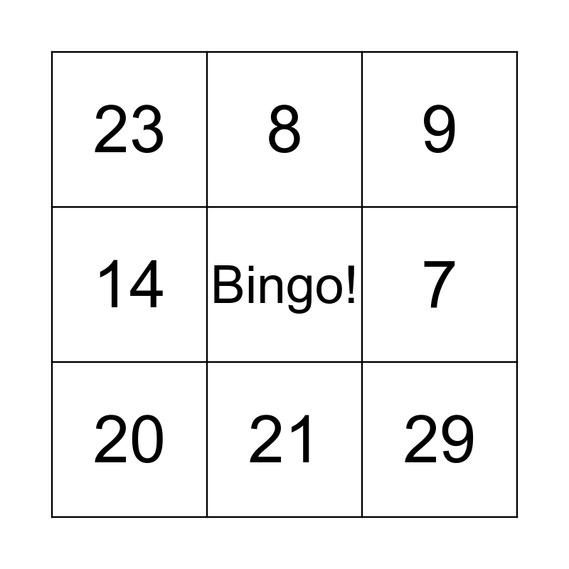 This bingo card has a free space and 28 words: 1, 2, 5, 6, 7, 9, 8, 10, 11, 12, 13, 14, 15, 16, 17, 18, 19, 20, 21, 22, 23, 24, 25, 26, 27, 28, 29 and 30.
