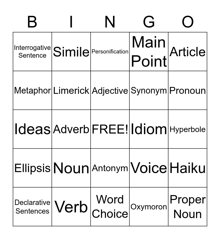 This bingo card has a free space and 24 words: Noun, Verb, Adjective, Declarative Sentences, Article, Interrogative Sentence, Metaphor, Simile, Idiom, Antonym, Synonym, Ideas, Voice, Haiku, Limerick, Oxymoron, Hyperbole, Personification, Pronoun, Adverb, Proper Noun, Ellipsis, Main Point and Word Choice.