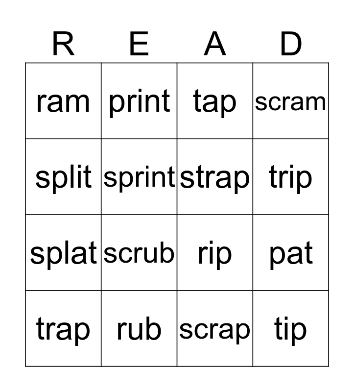 This bingo card has 20 words: pat, plat, tap, strip, trap, split, rub, ram, splat, print, scrub, rip, sprint, tip, strap, cram, trip, scram, scrap and rap.