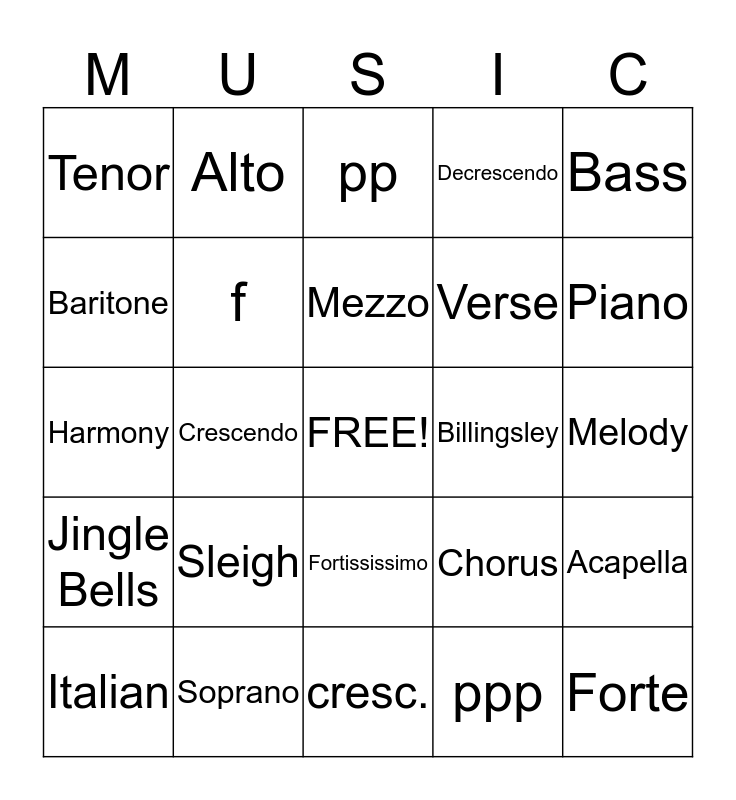 This bingo card has a free space and 26 words: Fortississimo, ppp, Mezzo, Soprano, Bass, Tenor, Baritone, Alto, Melody, Chorus, Verse, Harmony, Acapella, Italian, Crescendo, Diminuendo, Decrescendo, Jingle Bells, pp, Forte, Piano, cresc., Billingsley, Sleigh, f and mp.