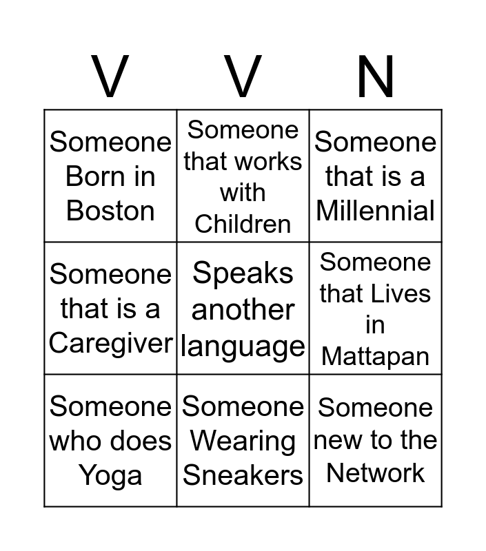 This bingo card has 9 words: Someone who does Yoga, Someone that is a Millennial, Someone that works with Children, Someone that is a Caregiver, Someone Born in Boston, Someone that Lives in Mattapan, Speaks another language, Someone new to the Network and Someone Wearing Sneakers.