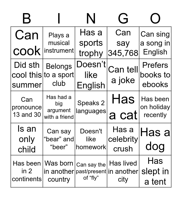 This bingo card has 25 words: Is an only child, Was born in another country, Speaks 2 languages, Has lived in another city, Can sing a song in English, Can cook, Plays a musical instrument, Has a sports trophy, Has a cat, Has a dog, Did sth cool this summer, Belongs to a sport club, Can say the past/present of “fly”, Has a celebrity crush, Prefers books to ebooks, Has been in 2 continents, Has had a big argument with a friend, Doesn’t like English, Can tell a joke, Has been on holiday recently, Can pronounce 13 and 30, Can say “bear” and “beer”, Doesn't like homework, Can say 345,768 and Has slept in a tent.