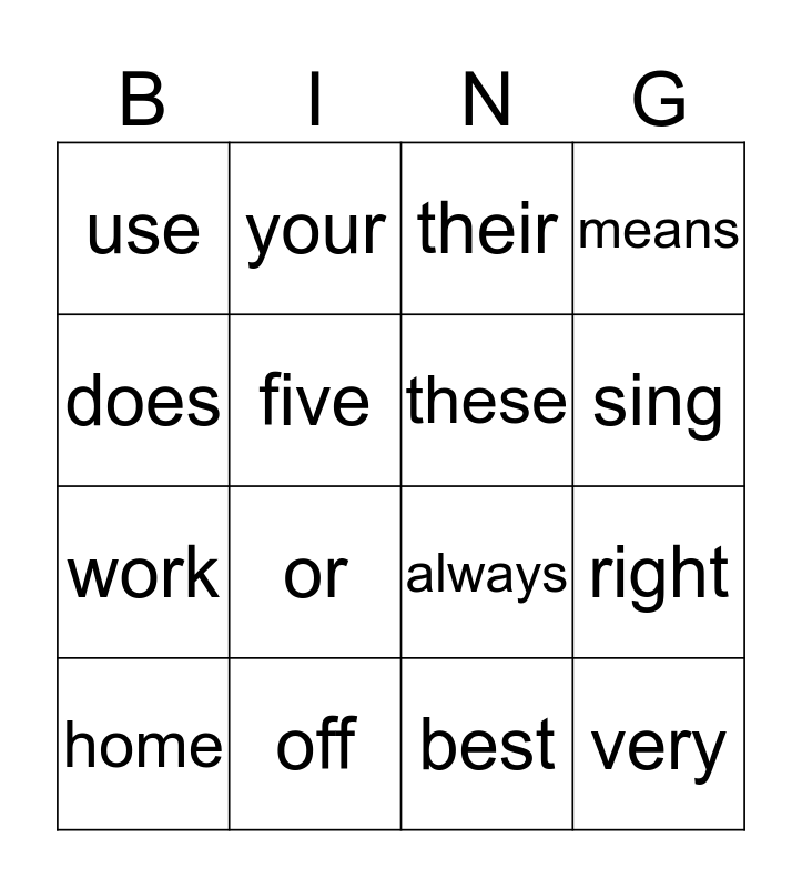 This bingo card has 16 words: off, right, their, use, work, your, always, best, does, five, home, means, or, sing, these and very.