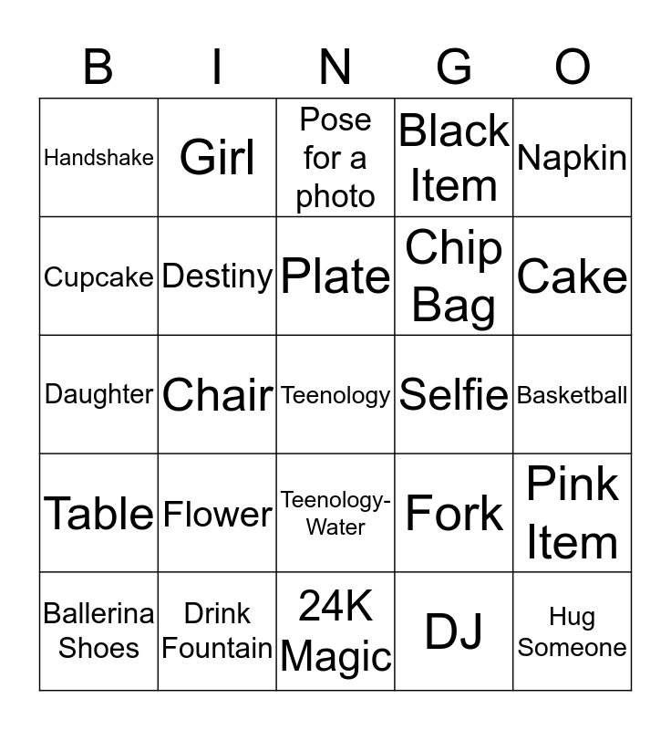 This bingo card has a free space and 34 words: Popcorn, Pretzel, Candy Apple, Music Note, Basketball, Cupcake, Destiny, 24K Magic, Chip Bag, Hug Someone, Daughter, Girl, DJ, Gold Item, Table, Chair, Teenology- Water, Selfie, Pink Item, Ballerina Shoes, Drink Fountain, Gift, Black Item, Cake, Photo Booth, Flower, Pose for a photo, Hi-Five, Napkin, Handshake, Cup, Plate, Fork and Boy.
