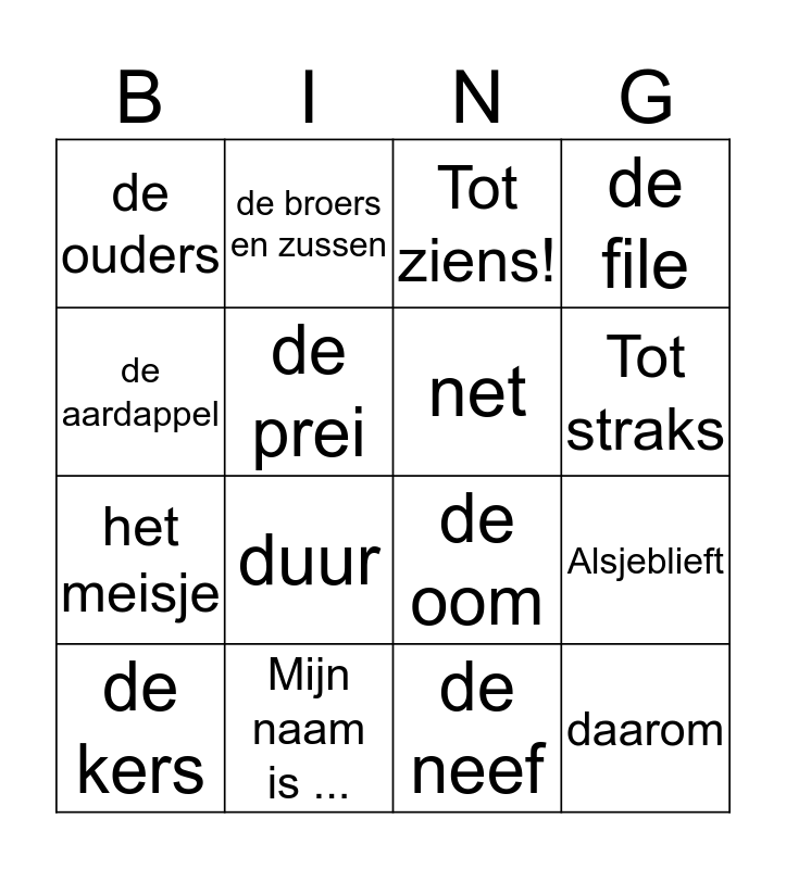 This bingo card has 16 words: Mijn naam is ..., Alsjeblieft, Tot ziens!, de ouders, het meisje, de broers en zussen, de oom, de neef, de aardappel, de prei, de kers, de file, duur, Tot straks, net and daarom.