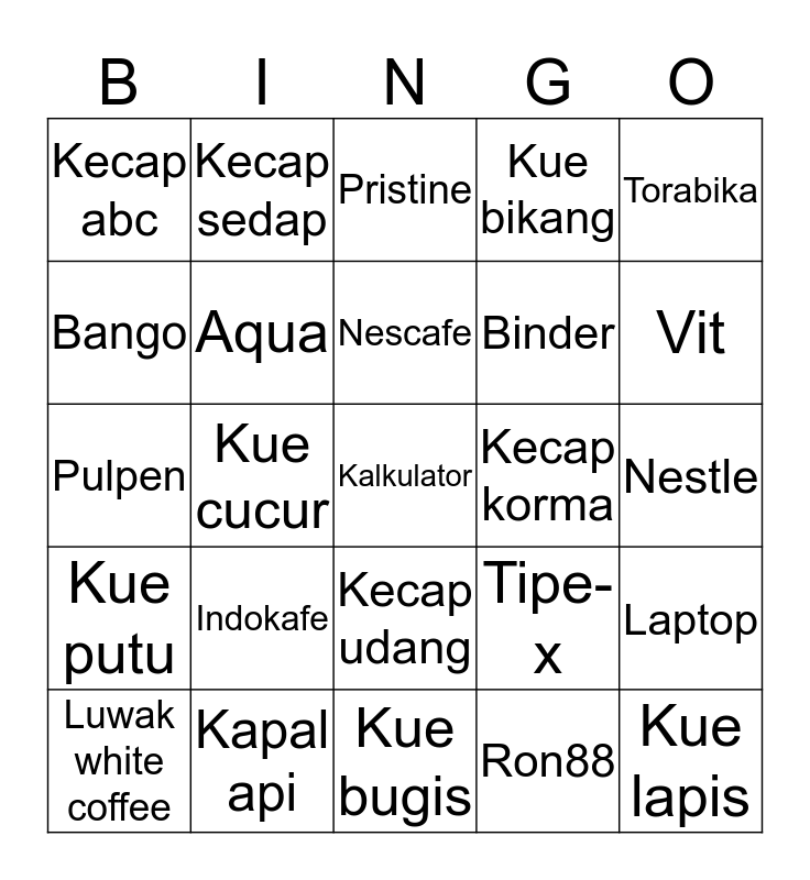 This bingo card has a free space and 24 words: Indokafe, Kapal api, Nescafe, Luwak white coffee, Torabika, Kecap abc, Bango, Kecap sedap, Kecap korma, Kecap udang, Binder, Pulpen, Tipe-x, Laptop, Aqua, Ron88, Nestle, Pristine, Vit, Kue cucur, Kue lapis, Kue putu, Kue bikang and Kue bugis.