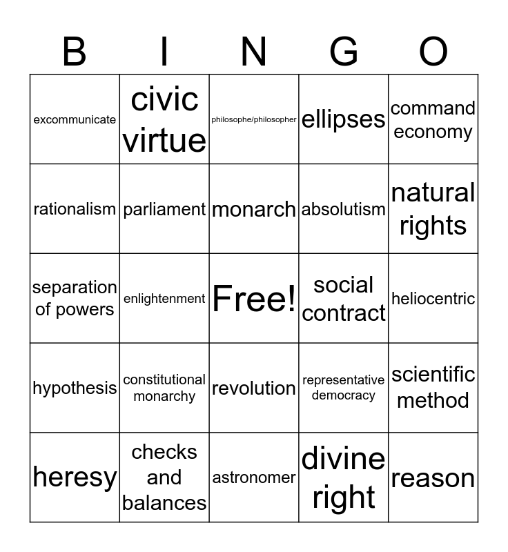 This bingo card has a free space and 24 words: constitutional monarchy, checks and balances, monarch, heresy, command economy, excommunicate, rationalism, civic virtue, social contract, revolution, absolutism, separation of powers, representative democracy, scientific method, parliament, divine right, heliocentric, philosophe/philosopher, natural rights, enlightenment, reason, hypothesis, ellipses and astronomer.