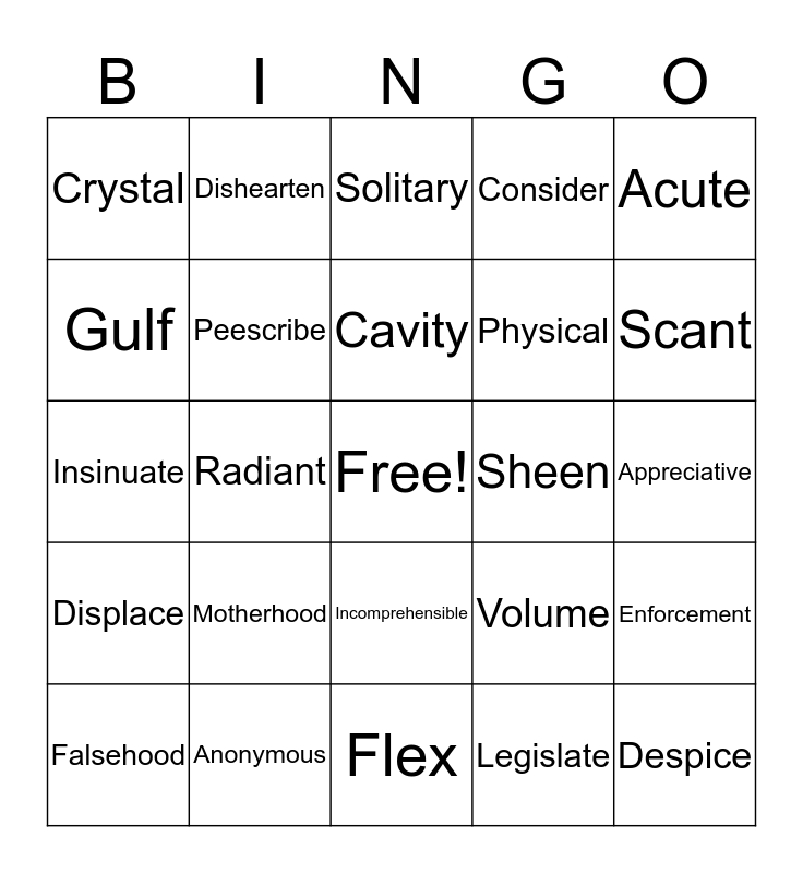 This bingo card has a free space and 24 words: Motherhood, Anonymous, Cavity, Falsehood, Acute, Crystal, Gulf, Dishearten, Sheen, Incomprehensible, Physical, Insinuate, Volume, Enforcement, Peescribe, Legislate, Appreciative, Solitary, Scant, Radiant, Despice, Displace, Consider and Flex.