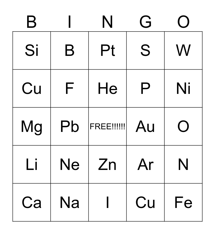 This bingo card has a free space and 29 words: Al, Na, Pt, K, W, Si, F, He, Au, N, Ca, Pb, Cu, Fe, Mg, C, I, Ar, Ni, Li, Ne, Ag, P, O, Cu, B, Zn, S and Br.