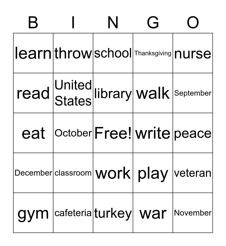 This bingo card has a free space and 24 words: classroom, cafeteria, library, gym, nurse, learn, read, throw, write, work, walk, eat, play, veteran, United States, war, peace, school, September, October, November, December, Thanksgiving and turkey.