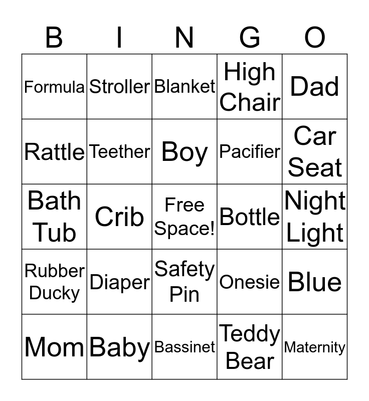 This bingo card has a free space and 24 words: Diaper, Baby, Boy, Mom, Dad, Formula, Rattle, Stroller, Bottle, Safety Pin, Pacifier, Bath Tub, Onesie, Blue, Teether, Teddy Bear, Night Light, Blanket, Car Seat, Crib, Maternity, Rubber Ducky, High Chair and Bassinet.