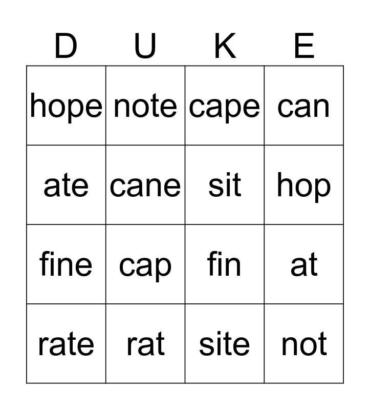 This bingo card has 16 words: rat, at, cape, hope, fine, note, fin, site, ate, cane, rate, can, cap, hop, sit and not.
