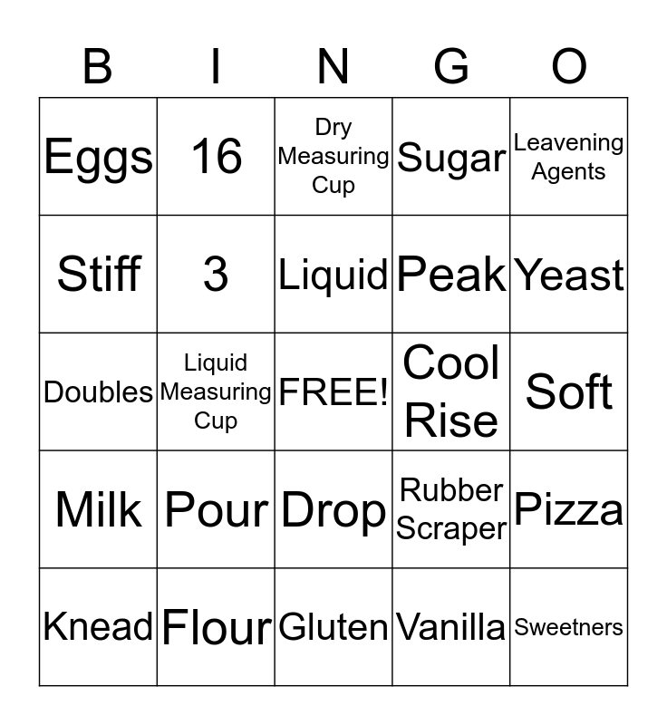 This bingo card has a free space and 24 words: Pour, Flour, Liquid, Knead, Leavening Agents, Eggs, Stiff, 16, Cool Rise, Drop, Peak, Doubles, Rubber Scraper, Pizza, 3, Vanilla, Soft, Dry Measuring Cup, Yeast, Liquid Measuring Cup, Sweetners, Milk, Sugar and Gluten.
