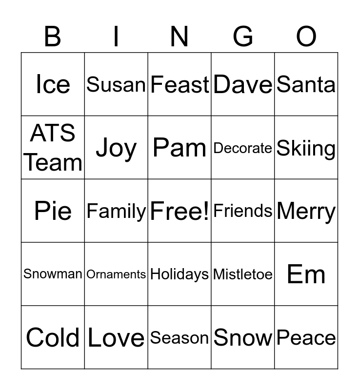 This bingo card has a free space and 29 words: Cold, Eggnog, Family, Gifts, Ice, Feast, Joy, Ornaments, Friends, Love, Merry, Peace, Season, Snow, Skiing, Winter, Holidays, Snowman, Santa, Pie, Mistletoe, Fireplace, Decorate, ATS Team, Dave, Susan, Em, Pam and Wayne.
