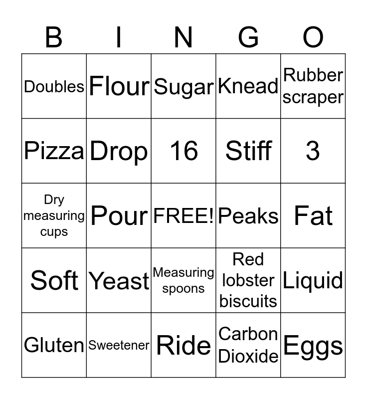 This bingo card has a free space and 24 words: Yeast, Sweetener, 16, Gluten, Rubber scraper, Doubles, Pizza, Flour, Peaks, Measuring spoons, Stiff, Dry measuring cups, Red lobster biscuits, Liquid, Drop, Carbon Dioxide, Fat, Sugar, 3, Pour, Eggs, Soft, Knead and Ride.