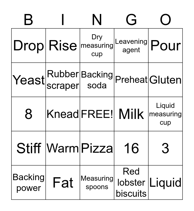This bingo card has a free space and 24 words: Warm, Fat, Backing soda, Backing power, Pour, Drop, Yeast, Rise, Milk, Pizza, Preheat, 8, 16, 3, Rubber scraper, Red lobster biscuits, Liquid measuring cup, Dry measuring cup, Gluten, Knead, Liquid, Stiff, Leavening agent and Measuring spoons.