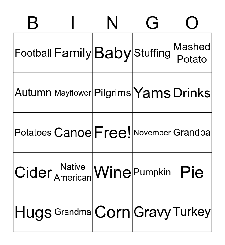 This bingo card has a free space and 46 words: Thanks, Turkey, Food, Corn, Native American, Bread, Family, Gathering, Autumn, Harvest, Mayflower, Stuffing, Pie, Pumpkin, Scarecrow, Friends, Pilgrims, November, Feast, Mashed Potato, Canoe, Gravy, Football, Yams, Salad, Drinks, Hugs, Love, Wine, Cider, Apples, Holiday, Tradition, Celebrate, Parades, Grandma, Grandpa, Mom, Dad, Sister, Brother, Baby, Potatoes, Wishbone, Plate and Table.