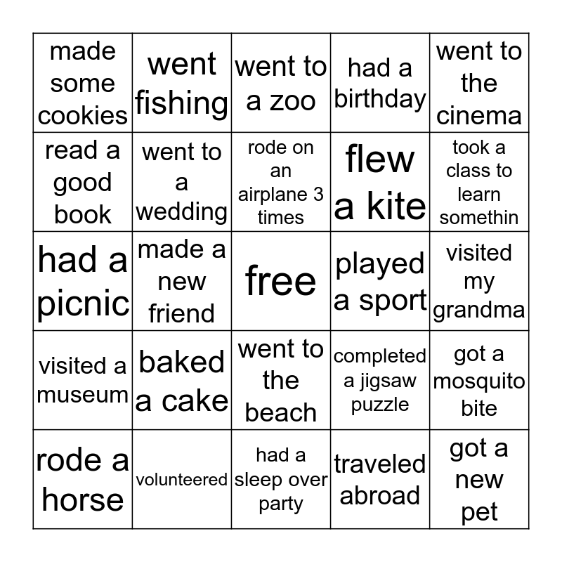 This bingo card has a free space and 24 words: rode a horse, baked a cake, rode on an airplane 3 times, traveled abroad, went to the cinema, made some cookies, went fishing, went to a zoo, played a sport, visited my grandma, had a picnic, went to a wedding, completed a jigsaw puzzle, got a mosquito bite, read a good book, volunteered, had a sleep over party, had a birthday, took a class to learn somethin, visited a museum, made a new friend, went to the beach, flew a kite and got a new pet.