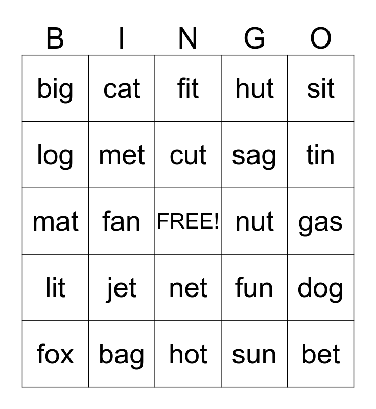 This bingo card has a free space and 24 words: jet, bag, cut, fox, sit, big, log, cat, nut, net, sag, mat, fun, dog, met, sun, gas, fit, tin, fan, bet, lit, hut and hot.