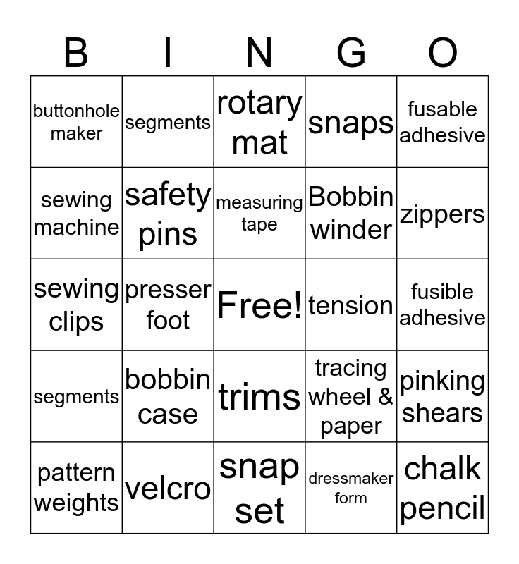 This bingo card has a free space and 74 words: sewing clips, rotary cutter, rotary mat, tailor tacks, straight pins, pin cushion, seam ripper, sewing machine, pattern weights, interfacing, bobbins, sewing caddy, measuring tape, sewing machine, buttons, presser foot, thimble, zippers, seam allowance, sewing clips, safety pins, segments, snaps, lace, chalk pencil, pin cushion, iron, snap set, pattern weights, sewing clips, fusable adhesive, rotary cutter, iron, presser foot, thimble, dressmaker form, sewing caddy, hooks, fabric, zig zag, snap set, velcro, serger, embroideryhoop, magnetic pin caddy, buttonhole maker, snap set, bobbin case, hooks & eyes, EZy-Pull bodkin, rotary cutter, seam allowance, fusible adhesive, seam ripper, sewing gauge, kit, trims, tailor tacks, shape, pinking shears, Bobbin winder, dress maker shears, segments, ribbons, tension, rotary mat, linen, seam creaser, tracing wheel & paper, pinking shears, interfacing, pattern weights, zippers and measuring tape.