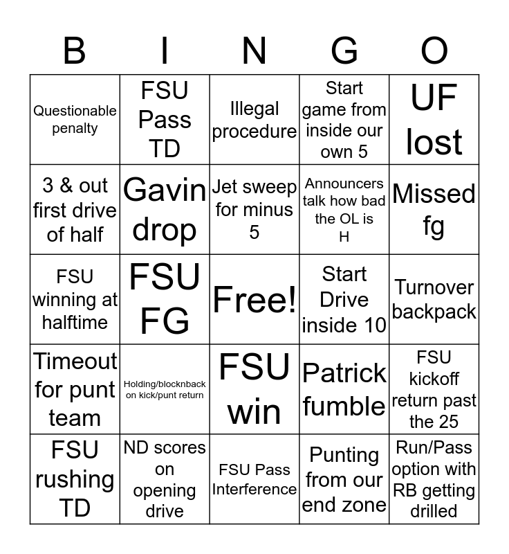 This bingo card has a free space and 27 words: Patrick fumble, WR screen for a loss, Announcers talk how bad the OL is H, FSU Pass Interference, 3 & out first drive of half, Illegal procedure, FSU Pass TD, Timeout for punt team, Start Drive inside 10, FSU kickoff return past the 25, FSU winning at halftime, Start game from inside our own 5, FSU rushing TD, ND scores on opening drive, Missed fg, 2 personal foul penalties, Gavin drop, Jet sweep for minus 5, Holding/blocknback on kick/punt return, Questionable penalty, Turnover backpack, Punting from our end zone, FSU FG, Run/Pass option with RB getting drilled, FSU win, UF lost and Miami lost.