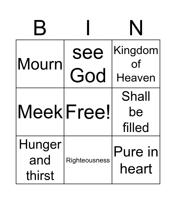 This bingo card has a free space and 17 words: Matthew, Poor in Spirit, Kingdom of Heaven, Mourn, Comforted, Meek, Shall inherit the Earth, Hunger and thirst, Righteousness, Shall be filled, Merciful, Obtain mercy, Pure in heart, see God, peacemakers, children of God and persecuted.