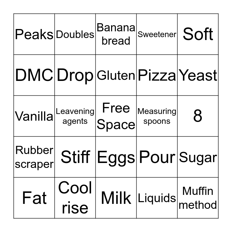 This bingo card has a free space and 24 words: Stiff, Cool rise, Gluten, Fat, Soft, Peaks, DMC, Doubles, Measuring spoons, Eggs, Pizza, Vanilla, Pour, Sugar, Drop, Liquids, 8, Banana bread, Yeast, Leavening agents, Muffin method, Rubber scraper, Sweetener and Milk.