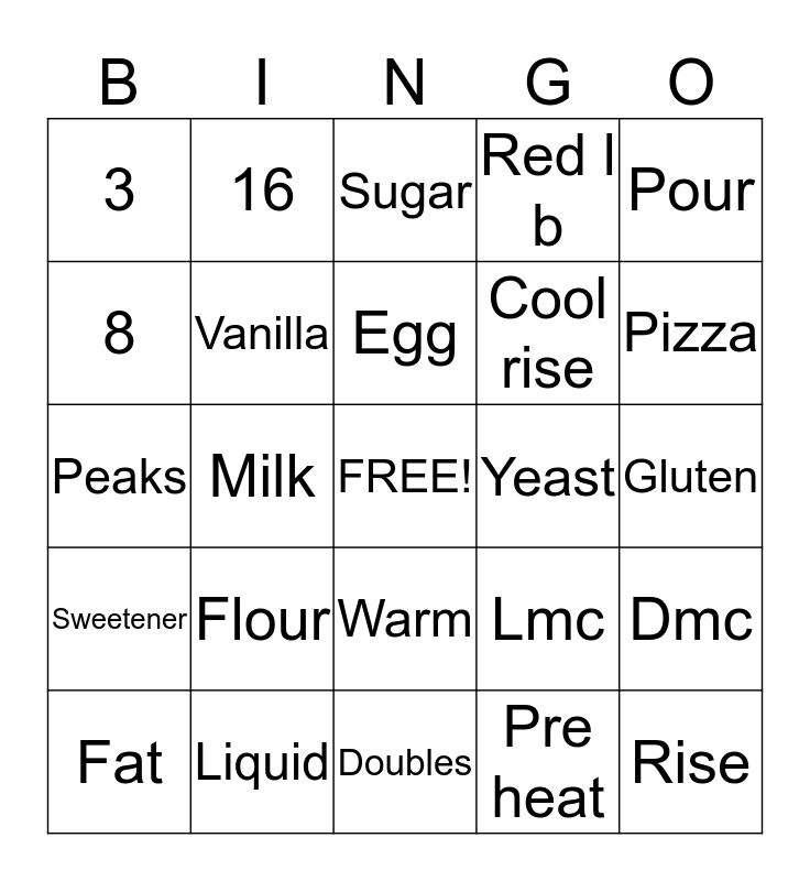 This bingo card has a free space and 24 words: Flour, Liquid, Egg, Fat, Pour, 3, 8, 16, Yeast, Warm, Cool rise, Peaks, Lmc, Dmc, Vanilla, Pre heat, Gluten, Sugar, Pizza, Milk, Rise, Sweetener, Red l b and Doubles.