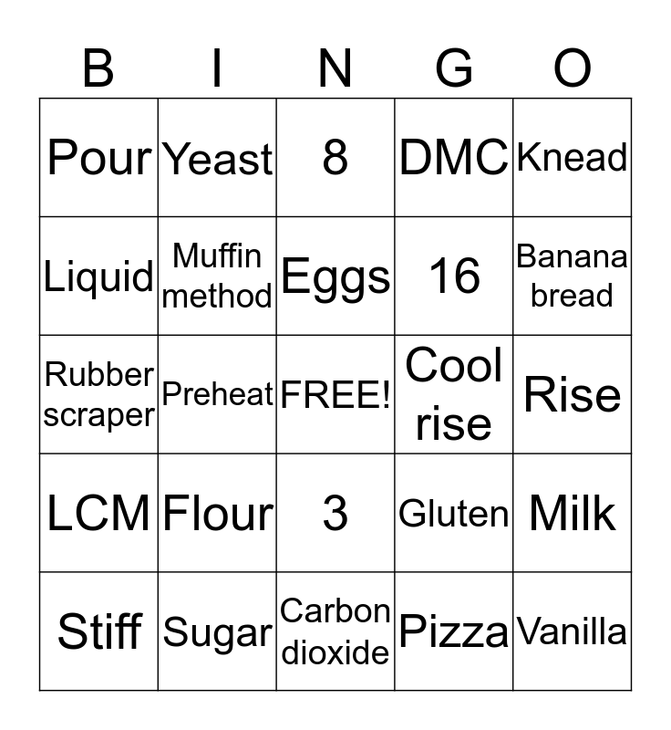 This bingo card has a free space and 24 words: Flour, Sugar, Eggs, Stiff, Knead, Pour, Liquid, Yeast, Cool rise, 3, 16, Rubber scraper, Gluten, Milk, Muffin method, Pizza, Rise, 8, Banana bread, Preheat, Vanilla, LCM, DMC and Carbon dioxide.
