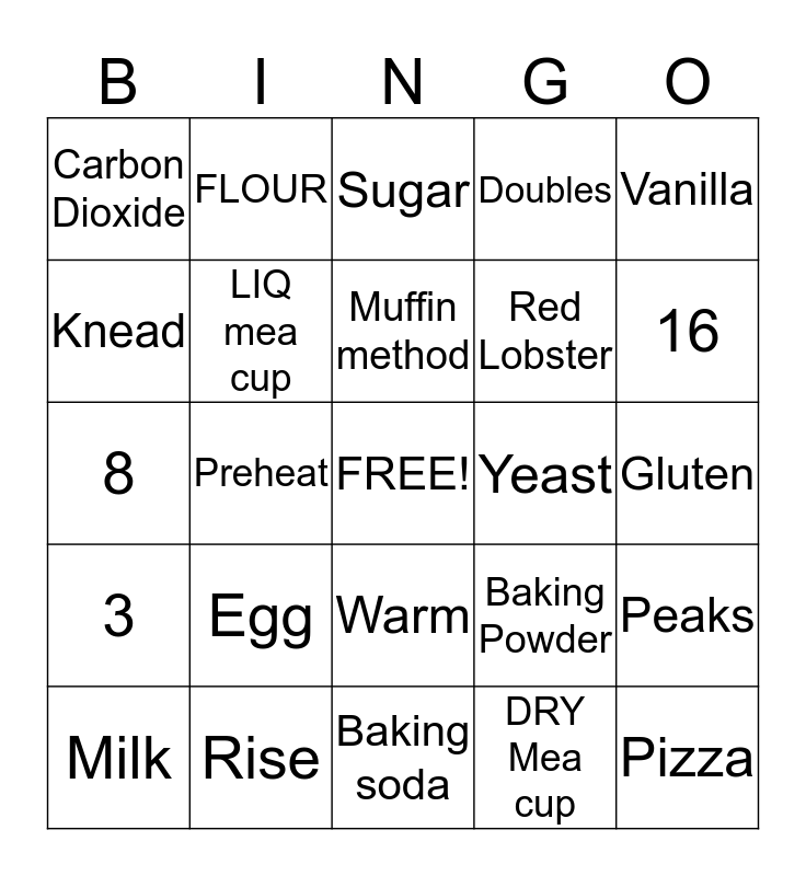 This bingo card has a free space and 24 words: Egg, Rise, Muffin method, Milk, Vanilla, Carbon Dioxide, Knead, FLOUR, Yeast, Warm, Red Lobster, 8, Baking Powder, Peaks, LIQ mea cup, DRY Mea cup, Gluten, Sugar, 16, Preheat, Pizza, 3, Doubles and Baking soda.