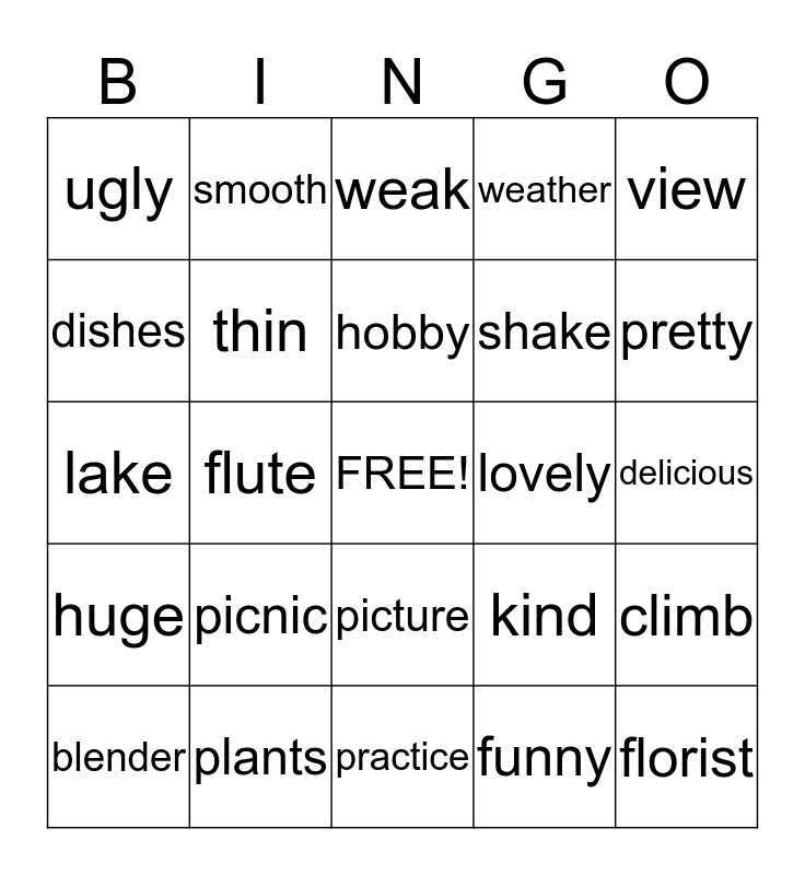 This bingo card has a free space and 31 words: practice, instrument, flute, concert, ugly, weak, thin, kind, lovely, funny, delicious, florist, tall, strong, pretty, chase, climb, picnic, huge, picture, view, cube, blender, smooth, shake, dishes, weather, lake, plants, hobby and short.