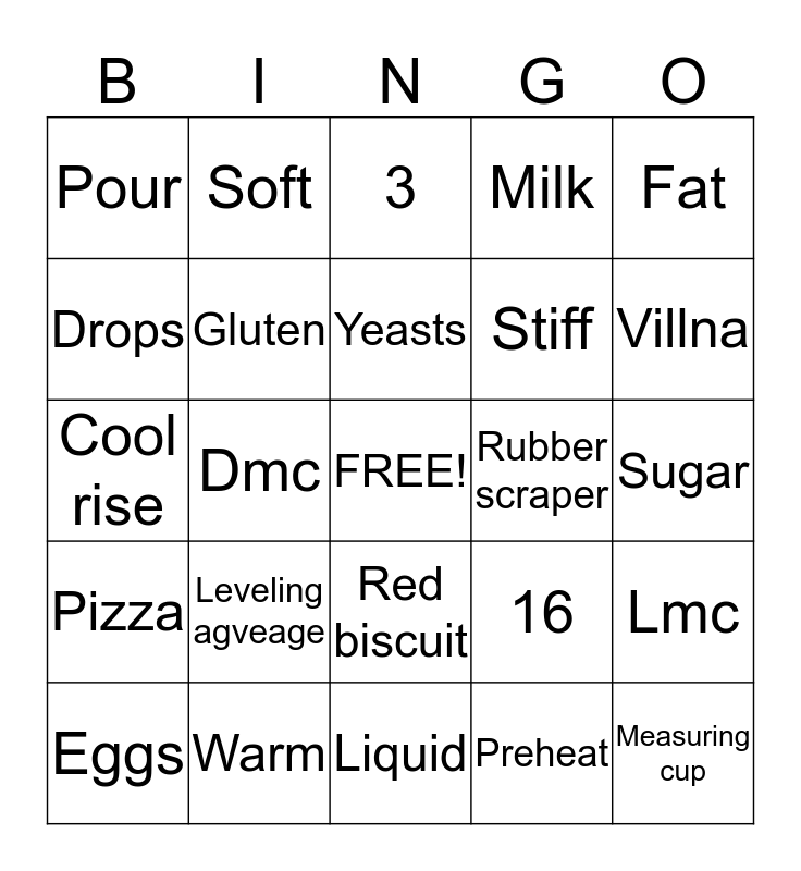This bingo card has a free space and 24 words: Leveling agveage, Warm, Yeasts, Eggs, Fat, Pour, Drops, Soft, Rubber scraper, Red biscuit, Stiff, Cool rise, 16, Lmc, Gluten, Preheat, Sugar, 3, Villna, Dmc, Measuring cup, Pizza, Milk and Liquid.