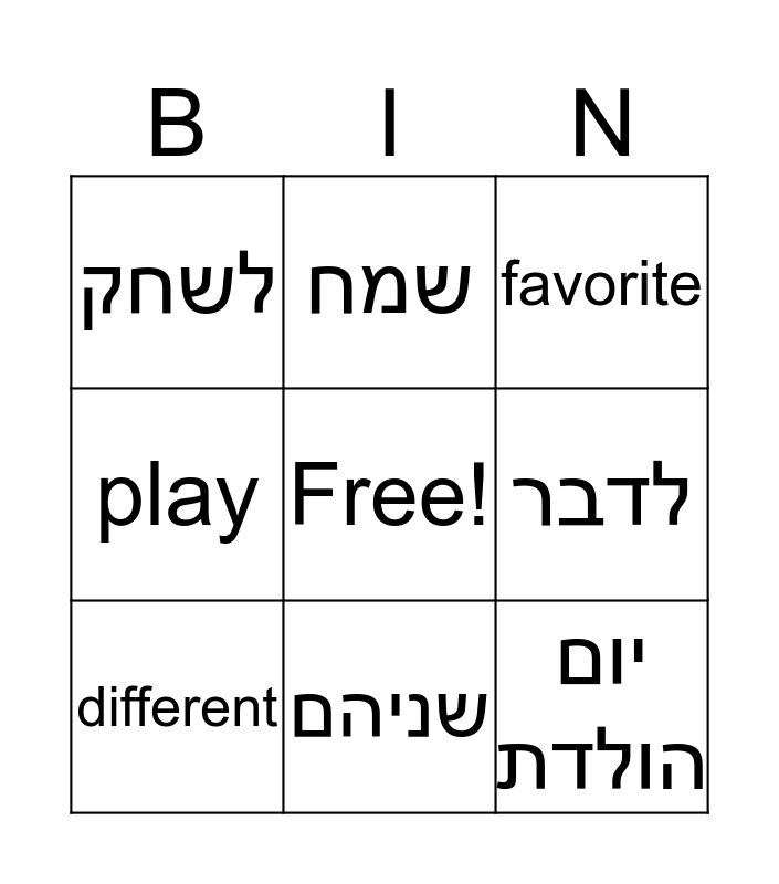 This bingo card has a free space and 79 words: cake, עוגה, favorite, האהוב ביותר, food, אוכל, hate, לשנוא, like, לאהוב, live, לגור, play, לשחק, speak, לדבר, bad things, דברים רעים, good things, דברים טובים, birthday, יום הולדת, both, שניהם, different, שונה, friend, חבר, have fun, "ליהנות/ "לעשות חיים, the same, אותו הדבר, TV program, תכנית טלוויזיה, twins, תאומים, bad, רע, big, גדול, fat, שמן, good, טוב, happy, שמח, long, ארוך, new, חדש, old, ישן/זקן, sad, עצוב, short, קצר/ נמוך, small, קטן, tall, גבוה, thin, רזה/דק, change places, להחליף מקומות, go back, לחזור, I have an idea, יש לי רעיון, It's not fair!, זה לא הוגן, king, מלך, meet, להיפגש,לפגוש, miss, להתגעגע, poor, עני and rich.