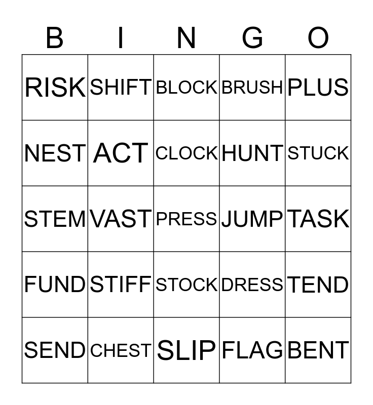 This bingo card has 29 words: SEND, FROG, VAST, BENT, RISK, BLOCK, ACT, STIFF, JUMP, CHEST, TASK, PRESS, SLIP, FLAG, STUCK, TRAP, STOCK, FUND, PLUS, STEM, DRESS, GRAB, HUNT, NEST, BRUSH, SHIFT, TEND, CLOCK and STUFF.