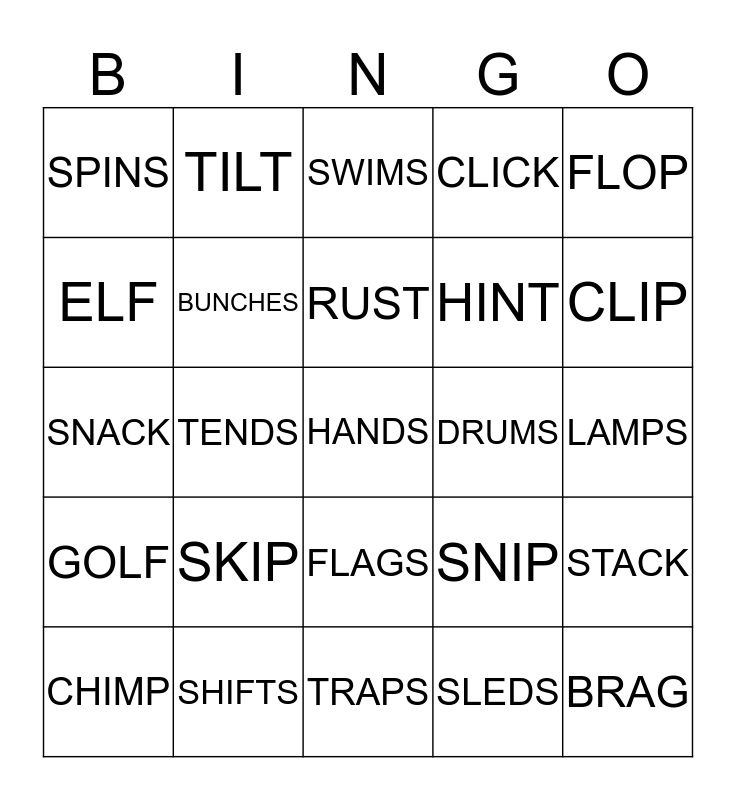 This bingo card has 30 words: SHIFTS, CRACKS, TENDS, INCHES, SPINS, SWIMS, BUNCHES, FLAGS, DRUMS, TRAPS, LAMPS, HANDS, SLEDS, BRAG, CLIP, MINT, SNIP, GOLF, SKIP, FLOP, SNACK, GRILL, TILT, HINT, ELF, CLICK, STACK, CHIMP, RUST and CLUCK.