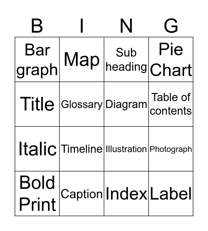This bingo card has 16 words: Bold Print, Caption, Sub heading, Pie Chart, Title, Map, Illustration, Photograph, Bar graph, Glossary, Index, Table of contents, Italic, Timeline, Diagram and Label.