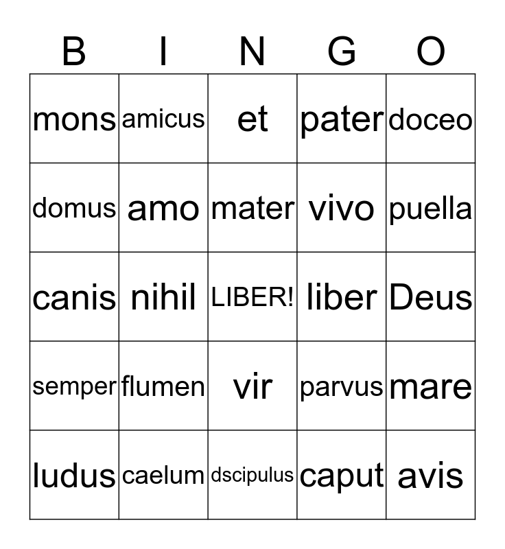 This bingo card has a free space and 24 words: ludus, flumen, mater, caput, doceo, mons, amicus, et, liber, Deus, canis, amo, parvus, mare, domus, caelum, dscipulus, pater, puella, semper, nihil, vir, vivo and avis.