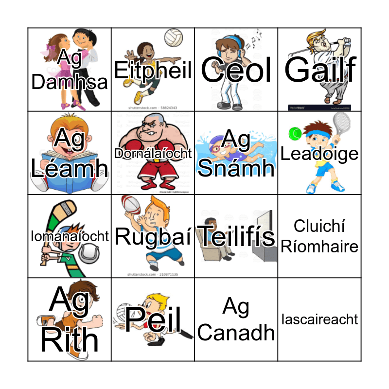 This bingo card has 13 images and 16 words: Ag Rith, Peil, Ceol, Gailf, Ag Léamh, Eitpheil, Teilifís, Cluichí Ríomhaire, Ag Damhsa, Dornálaíocht, Ag Canadh, Leadoige, Iománaíocht, Rugbaí, Ag Snámh and Iascaireacht.