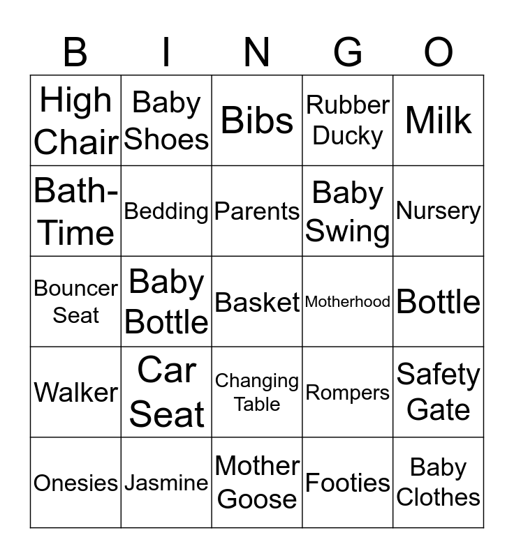 This bingo card has 68 words: Bath time, Baby Bottle, Baby Buggy, Baby Carrier, Baby Clothes, Baby Food, Baby Shoes, Baby Sitter, Baby Swing, Elephant, Walker, Baby Wear, Basket, Rubber Ducky, Bassinet, Bath-Time, Bedding, Bibs, Booties, Bottle, Bouncer Seat, Car Seat, Changing Table, Cradle, Crib, DiaperS, Diaper Bag, FeedingS, Footies, Formula, High Chair, Infant Carrier, Learning Blocks, Maternity, Milk, Mommy, Daddy, Mother Goose, Motherhood, Nursery, Onesies, Pacifier, Parents, Photographer, Playpen, Pregnancy, Rattle, Receiving Blanket, Rompers, Safety Gate, Safety Pin, Stroller, Teddy Bear, Teether, Toddler Toys, Ultrasound, Jasmine, John, Juan, Jynenne, Austin, Salcido, Blue, Grey, Chevron, Grandpa, Grandma and Uncle.