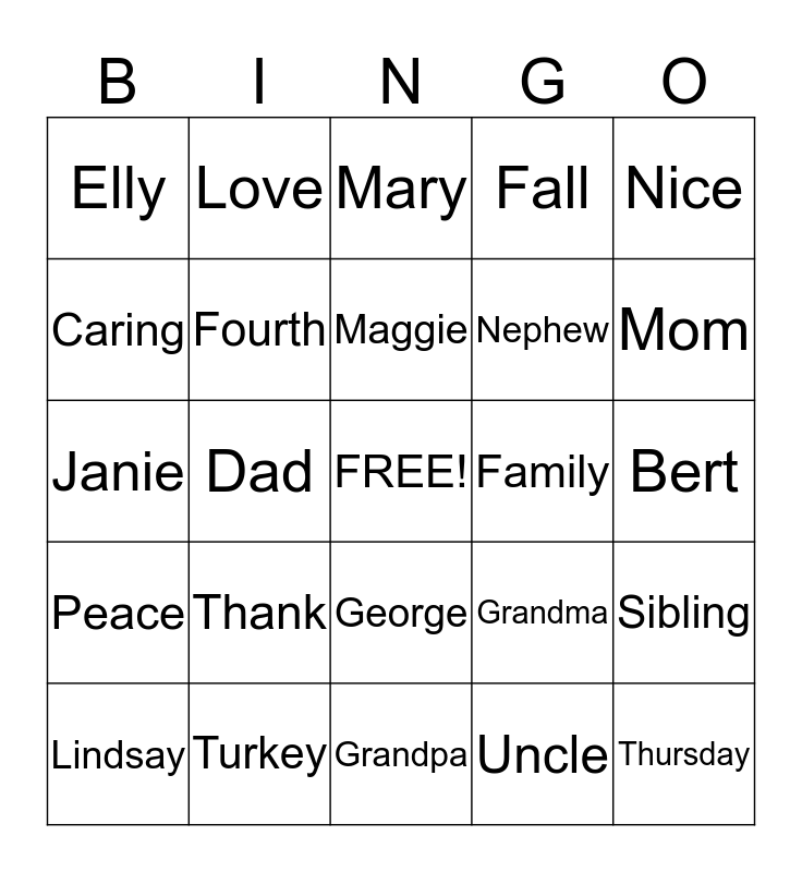 This bingo card has a free space and 24 words: Thank, Turkey, Maggie, Lindsay, Nice, Elly, Caring, Love, Family, George, Nephew, Janie, Grandma, Sibling, Fourth, Uncle, Bert, Mary, Mom, Dad, Thursday, Peace, Fall and Grandpa.