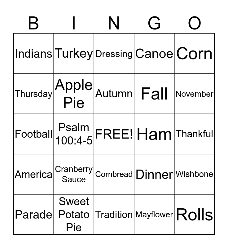 This bingo card has a free space and 24 words: Cranberry Sauce, Sweet Potato Pie, Autumn, Parade, Corn, Indians, Thursday, Turkey, Ham, Cornbread, Fall, Football, Dinner, Wishbone, Apple Pie, Mayflower, Thankful, Dressing, November, Psalm 100:4-5, Rolls, America, Canoe and Tradition.